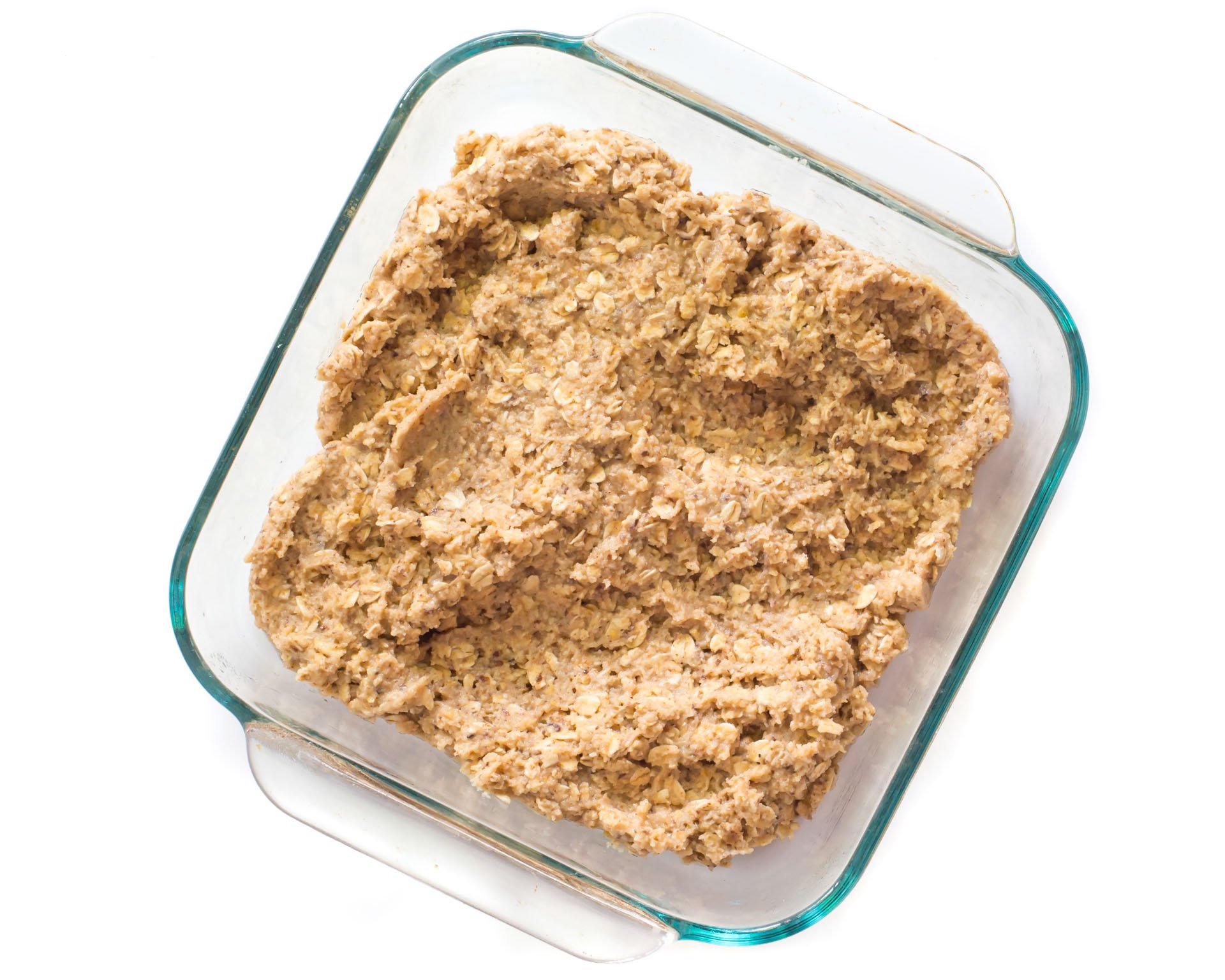 - Add Oat Crust: Press half of the oatmeal mixture into the bottom evenly.