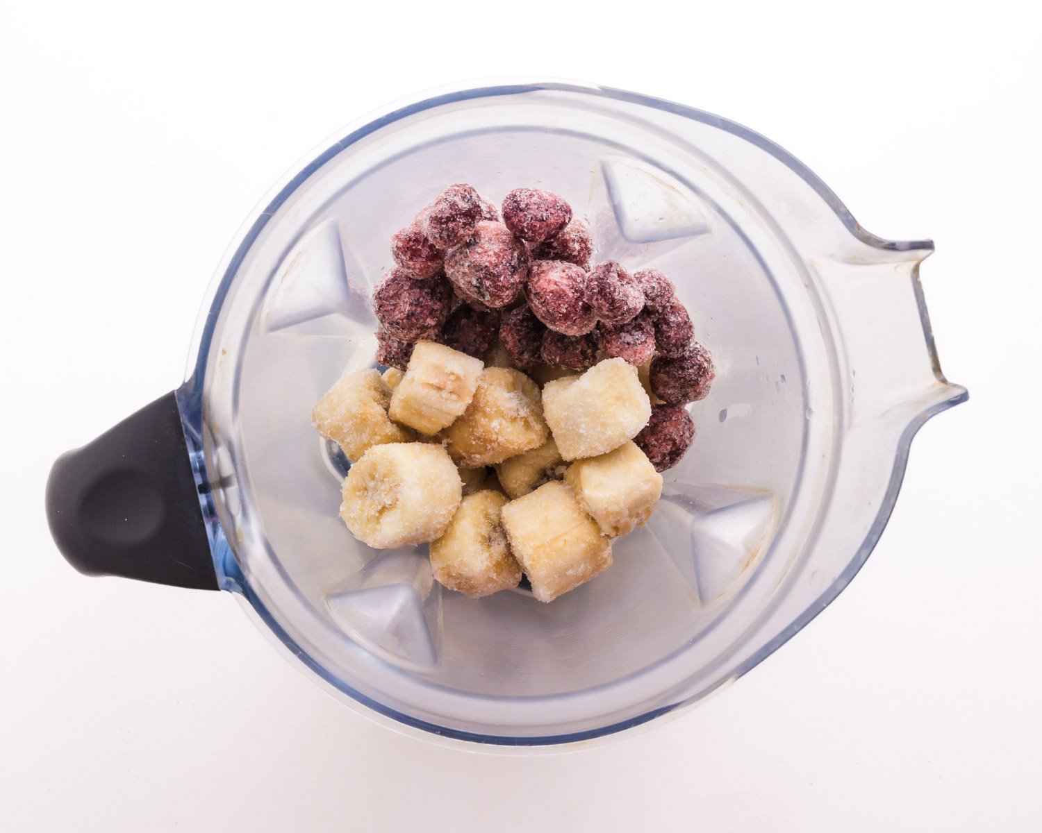 - Add frozen bananas and frozen cherries to a high-speed blender.