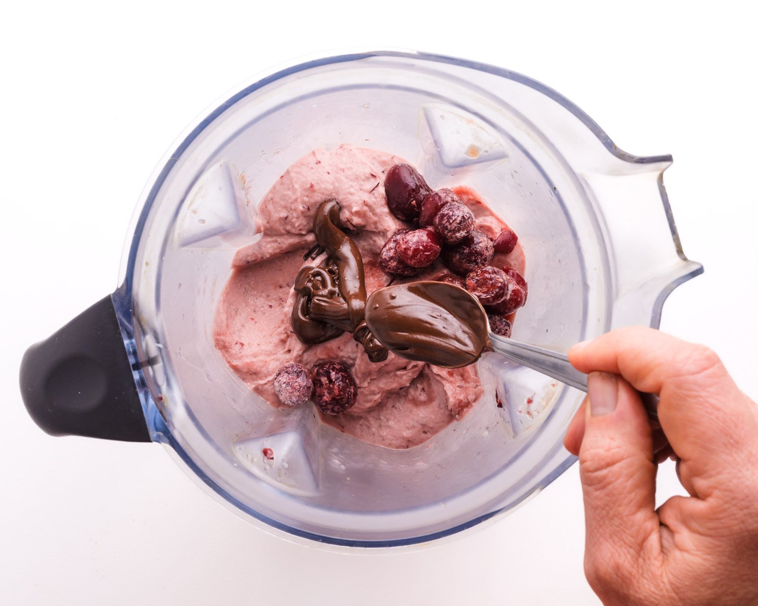 - Drizzle melted chocolate and remaining frozen cherries into the blender and pulse in short bursts to combine. Serve immediately for a soft-serve texture.