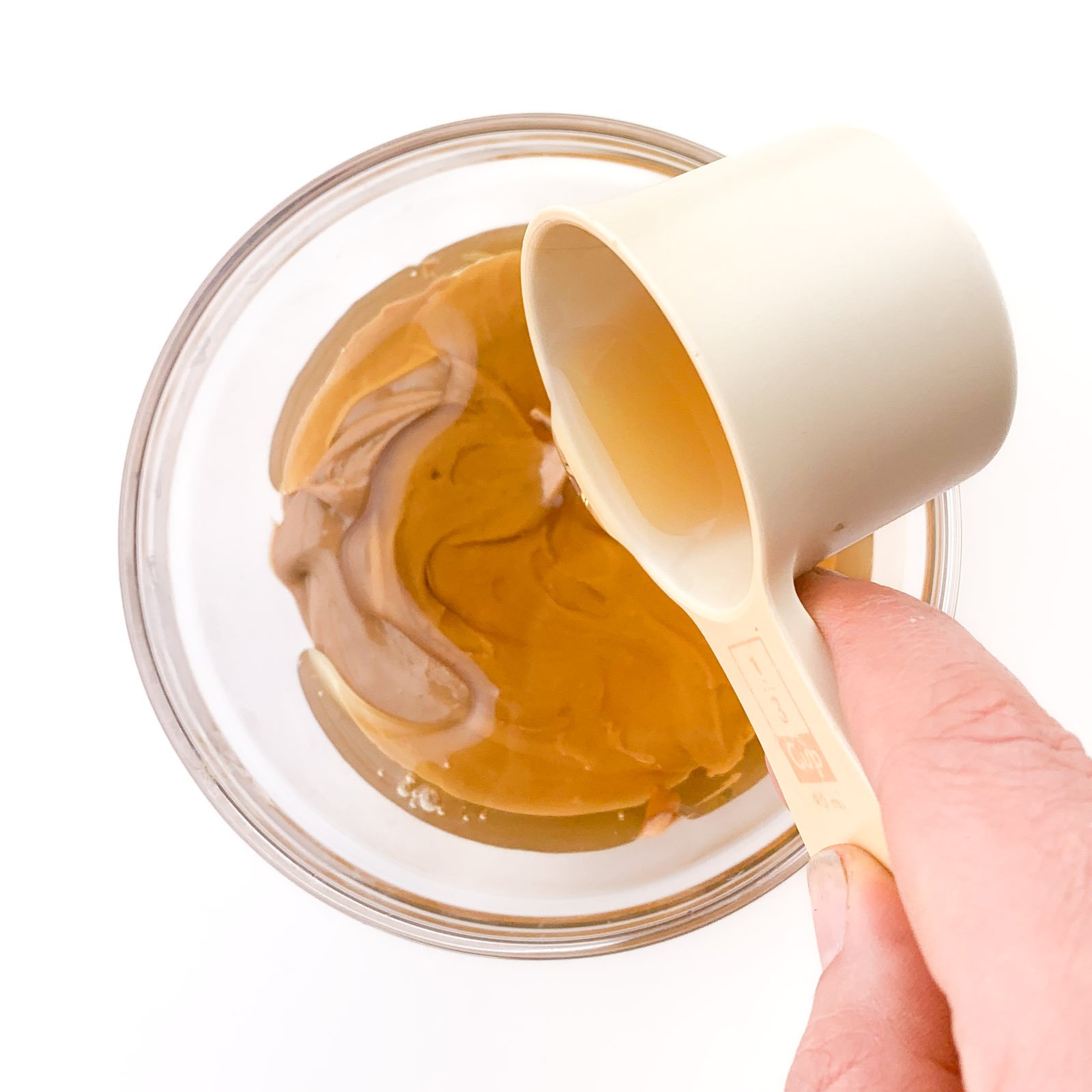 - Combine peanut butter and syrup in a microwave-safe bowl. Heat in 10-second increments until the peanut butter softens/melts. Add vanilla and stir until combined.