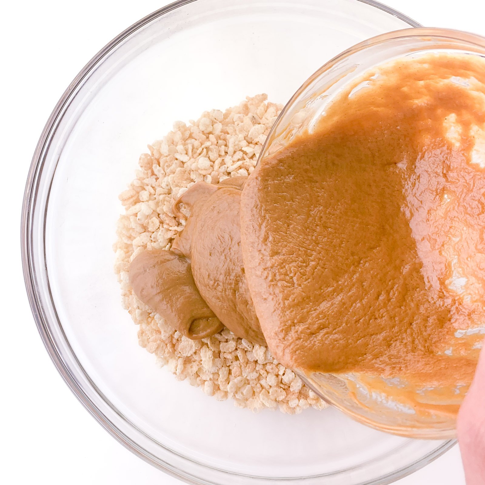 - Pour the rice crispy cereal into a large bowl and then pour peanut butter sauce over the top. Stir until the rice crispies are evenly coated.