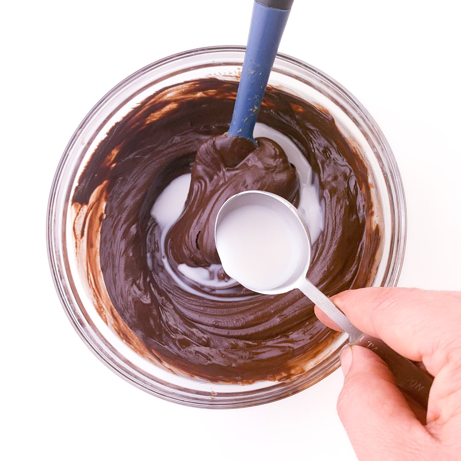 - Heat chocolate chips and vegan butter in a microwave-safe bowl and then stir in milk.