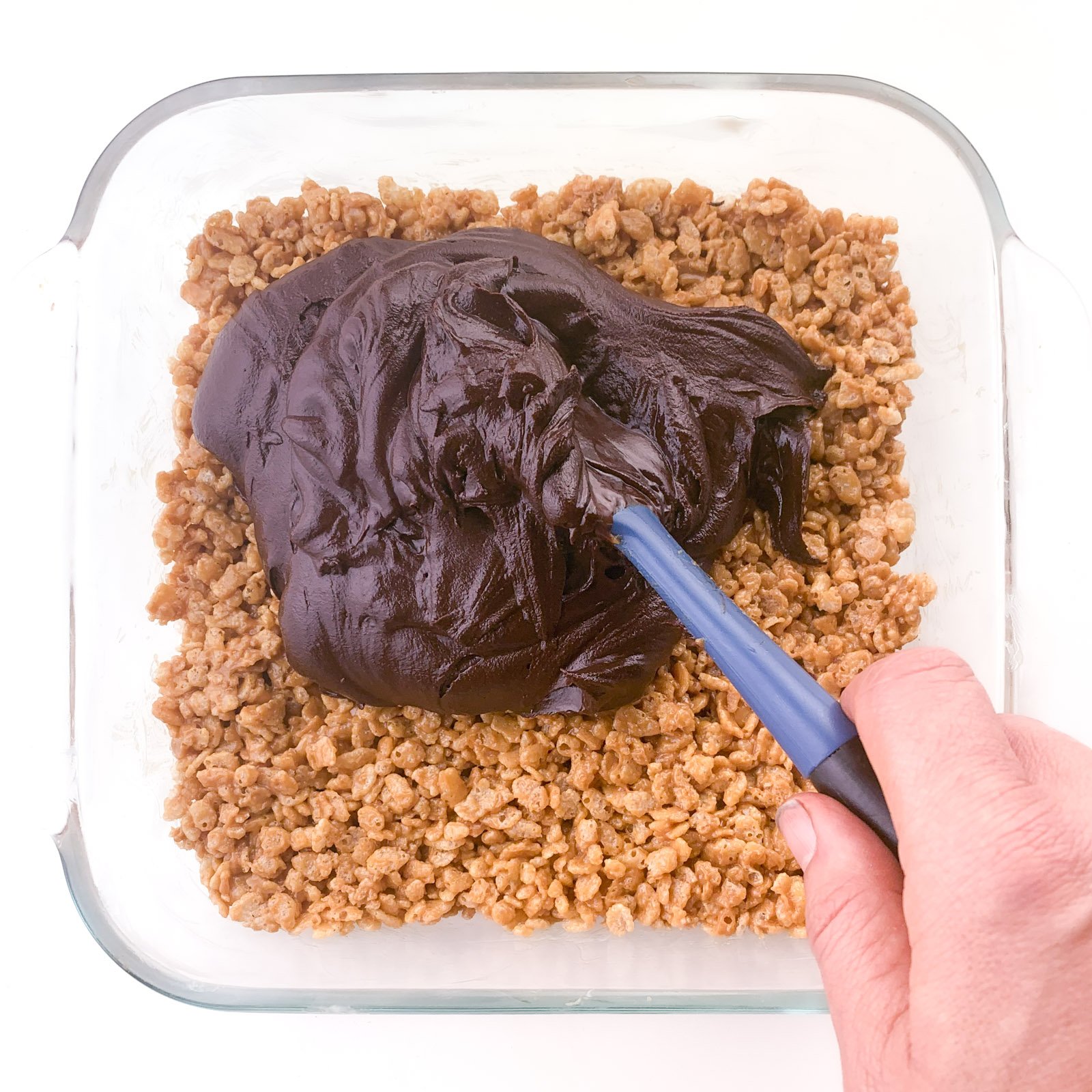 - Spread the chocolate fudge topping over the peanut butter layer.