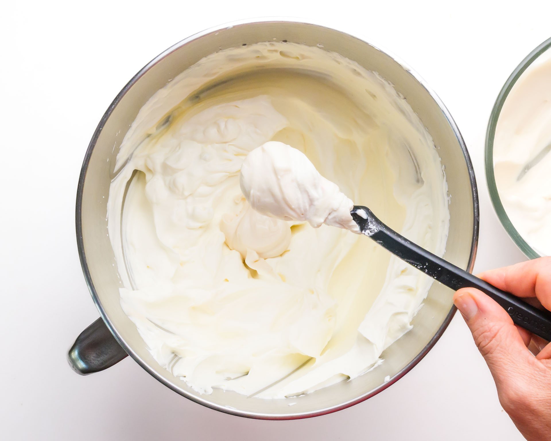 - Spoon the cream cheese mixture into the mixing bowl with the whipped cream, beating in between additions.