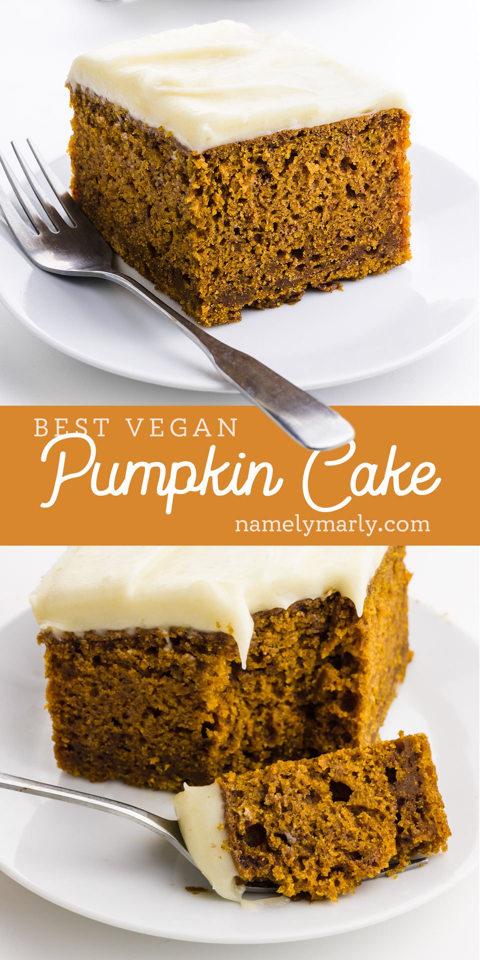 This vegan pumpkin cake is delicious without frosting, but I highly recommend serving it with my vegan cream cheese frosting. Be sure to allow it to cool completely before frosting it.