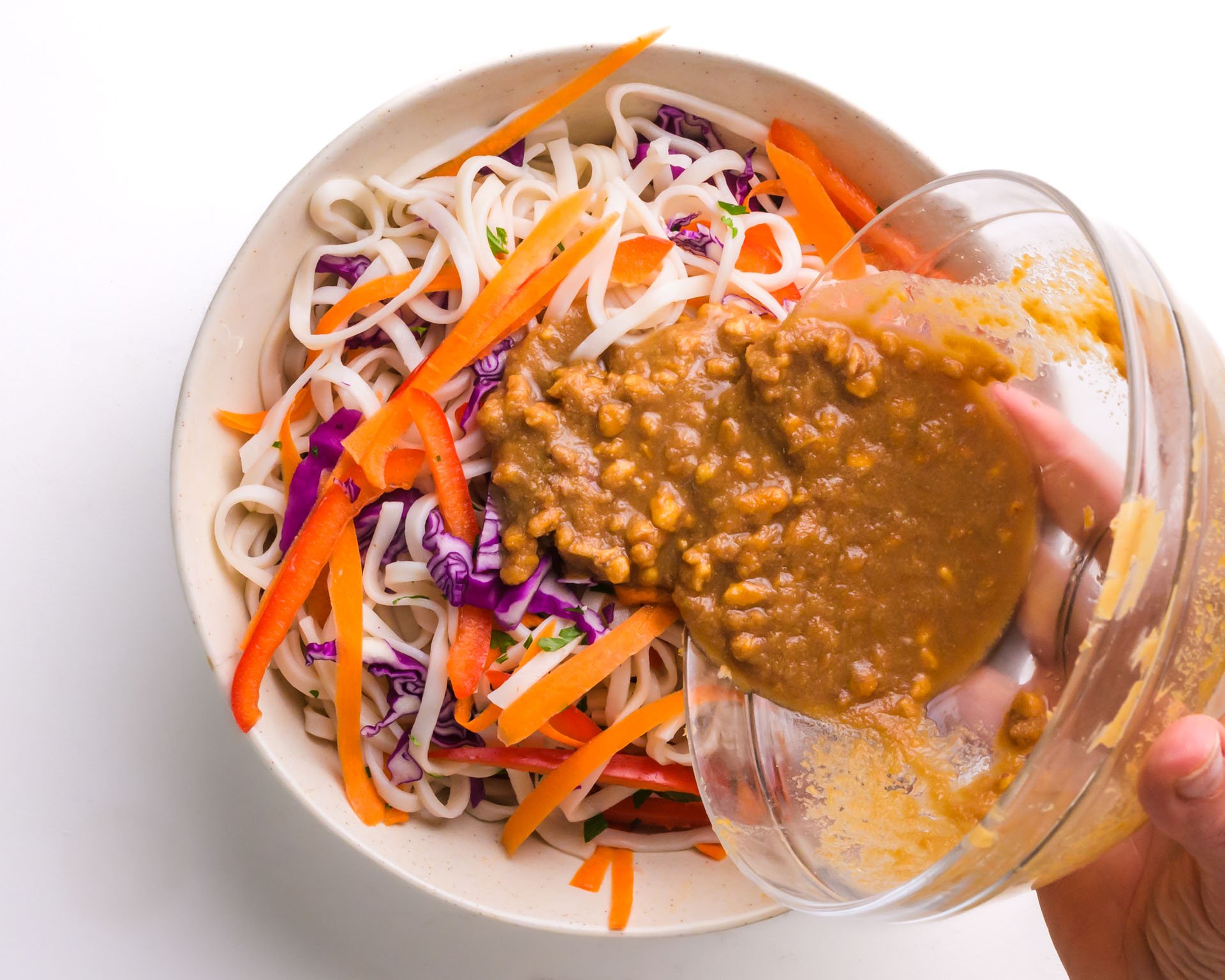 - Assemble the salad: In a large mixing bowl, combine the noodles, tofu, cabbage, bell pepper, carrot, green onions, and cilantro. Drizzle the peanut sauce over and toss until everything is well coated.