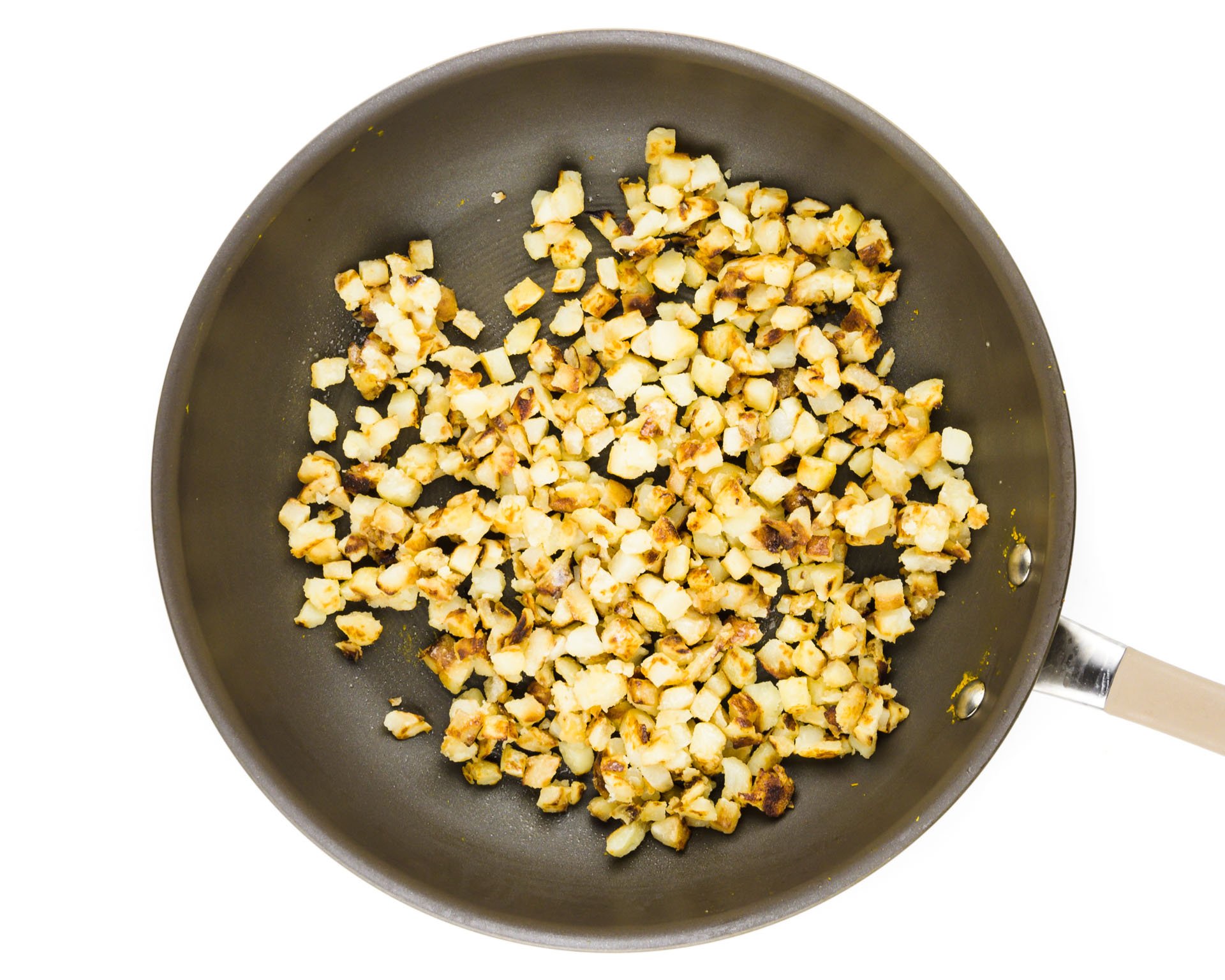 - Add vegetable oil to a large skillet or pot. Sauté potatoes and diced onion on medium heat until tender.