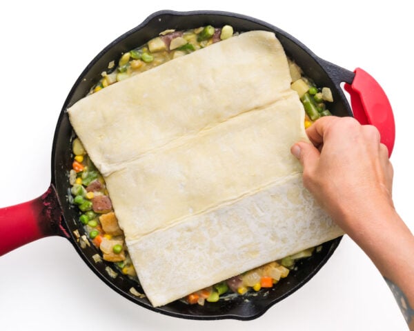 - Assemble Pot Pie: Remove from heat and stir in the chicken pieces. Lay the puff pastry over the skillet, tucking the edges slightly.1 sheet puff pastry, 1 tablespoon plant-based milk