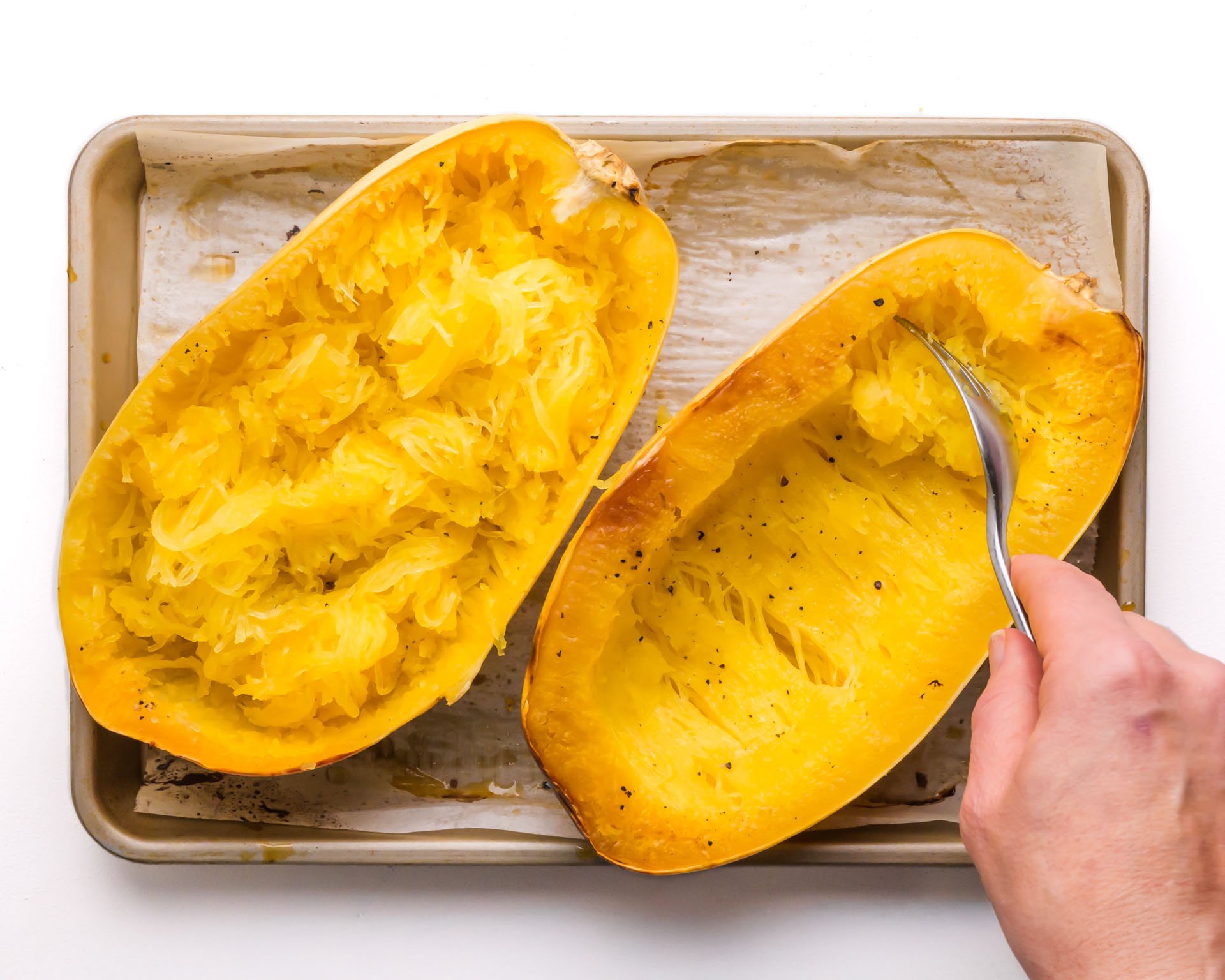 - Slice the spaghetti squash in half lengthwise and scoop out the seeds. Drizzle the cut sides with olive oil and sprinkle with a pinch of salt and pepper.Place the squash halves cut-side down on a baking sheet lined with parchment paper. Roast for 40–50 minutes.