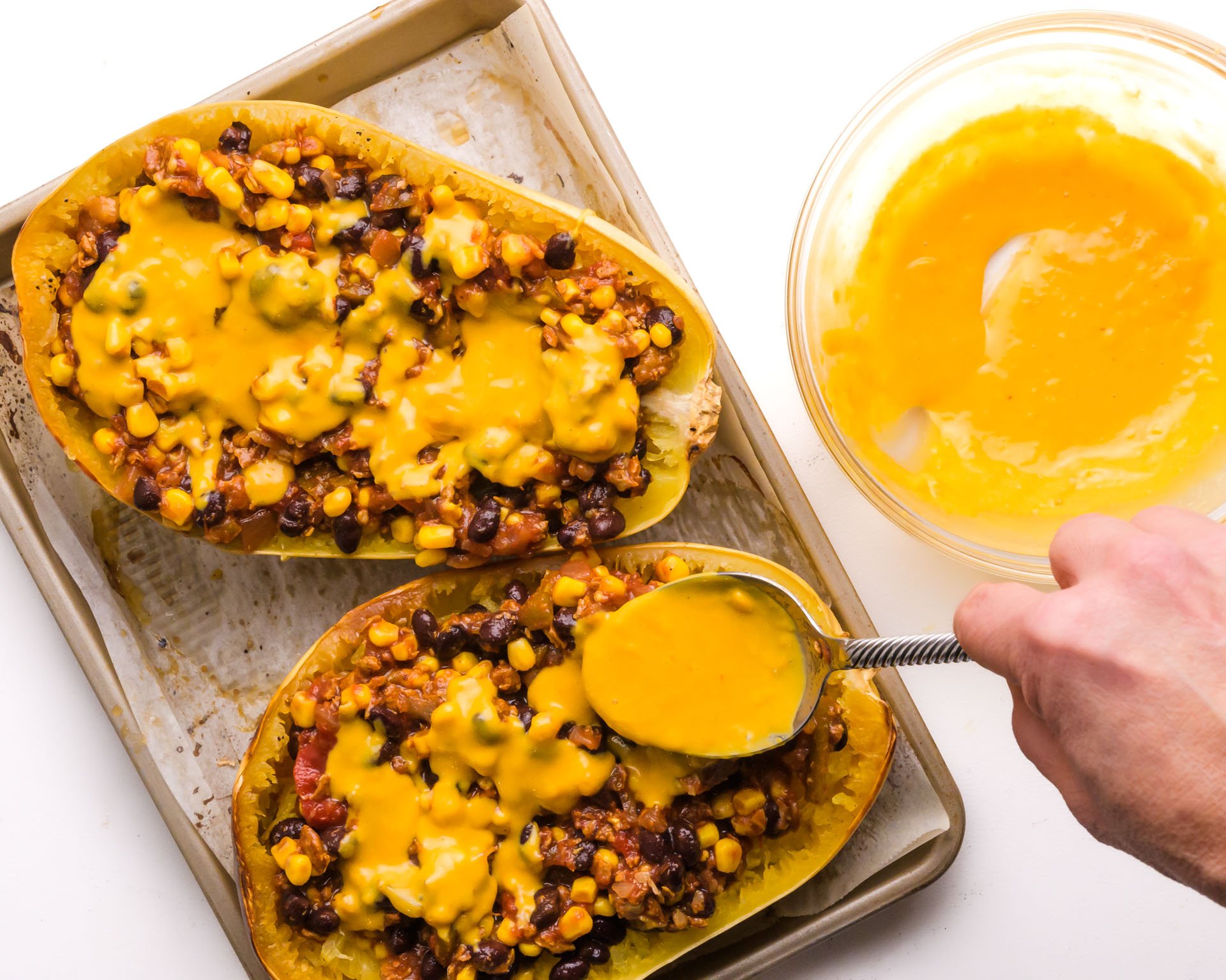 - Add melted vegan cheese sauce on top of the Mexican Filling.