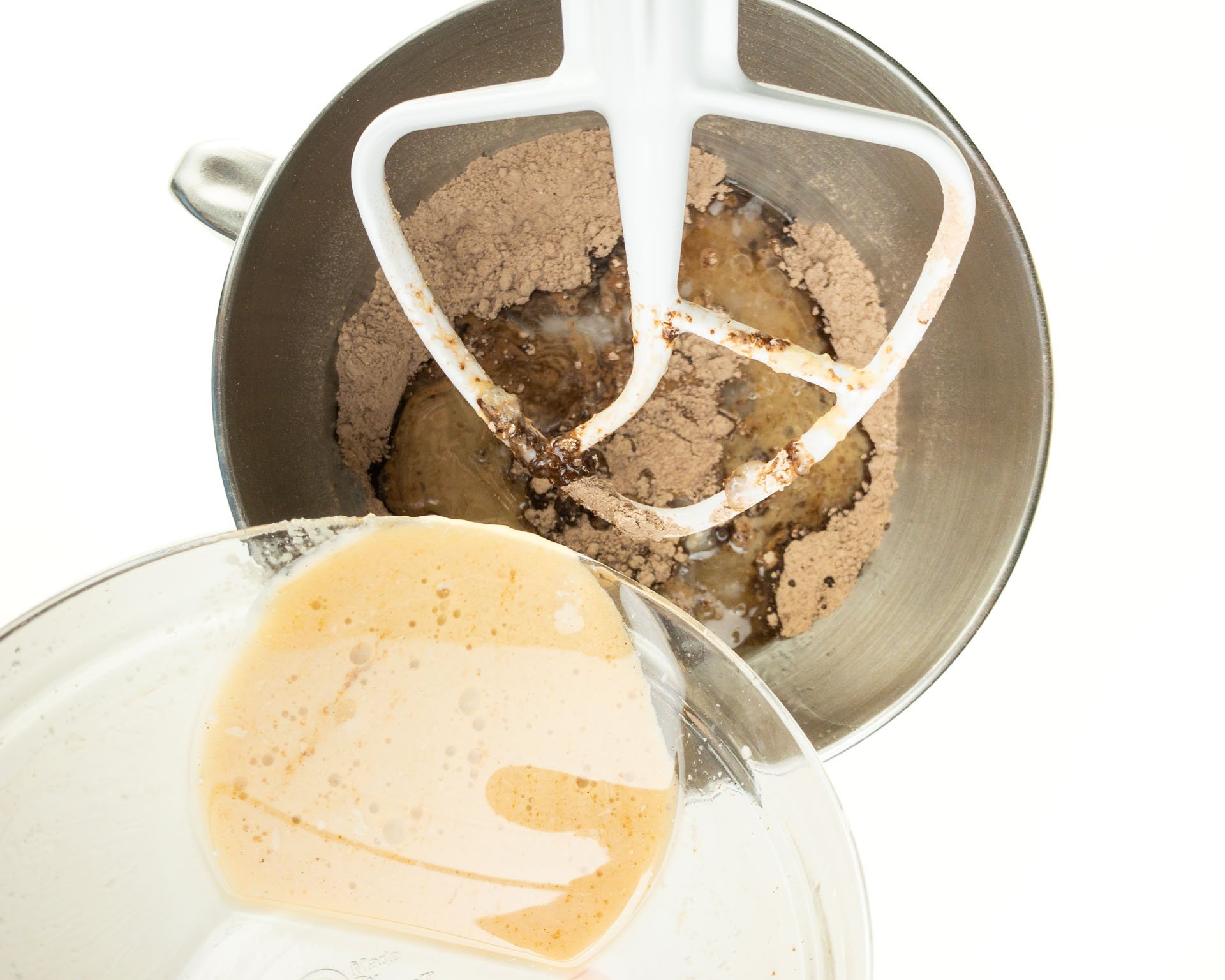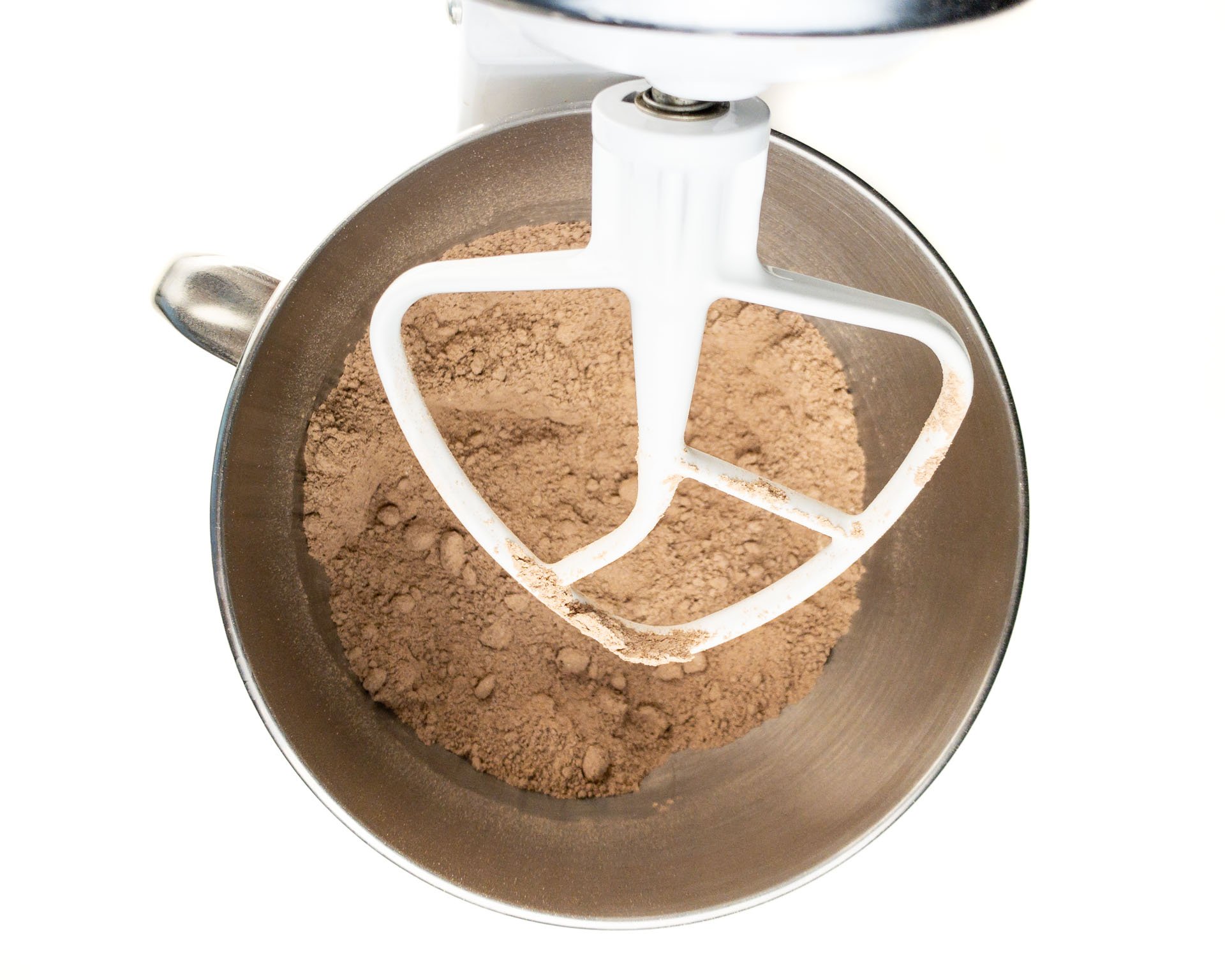 - In the bowl of your stand mixer fitted with the paddle attachment (or using a hand mixer) mix the sugars, flour, cocoa powder, baking soda, baking powder, and salt. Mix until combined.