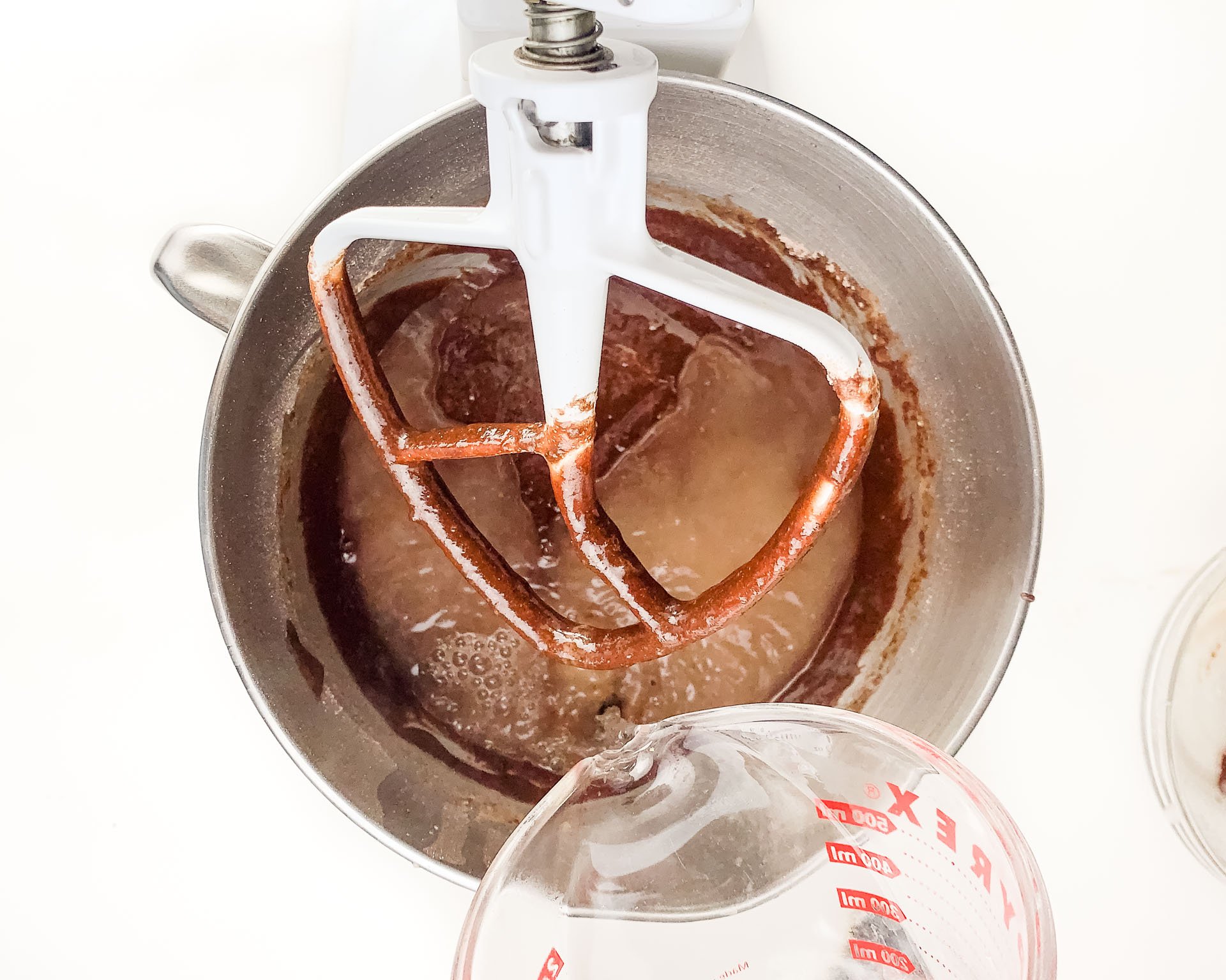 - Add the hot water and mix on low until combined. Use a spatula to scrape down the sides of the bowl. Then beat on medium for a minute. This batter will be runny.