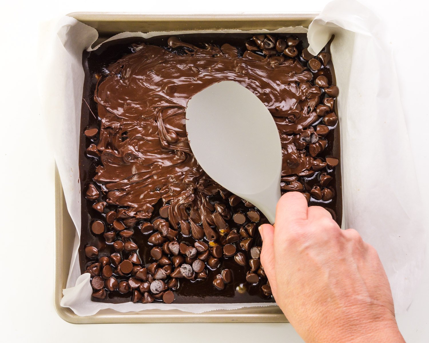 - Add the chocolate chips in a single layer over the toffee. Cover to allow the heat from the toffee to melt the chocolate chips. Use a spatula to spread the melted chocolate evenly over the toffee.